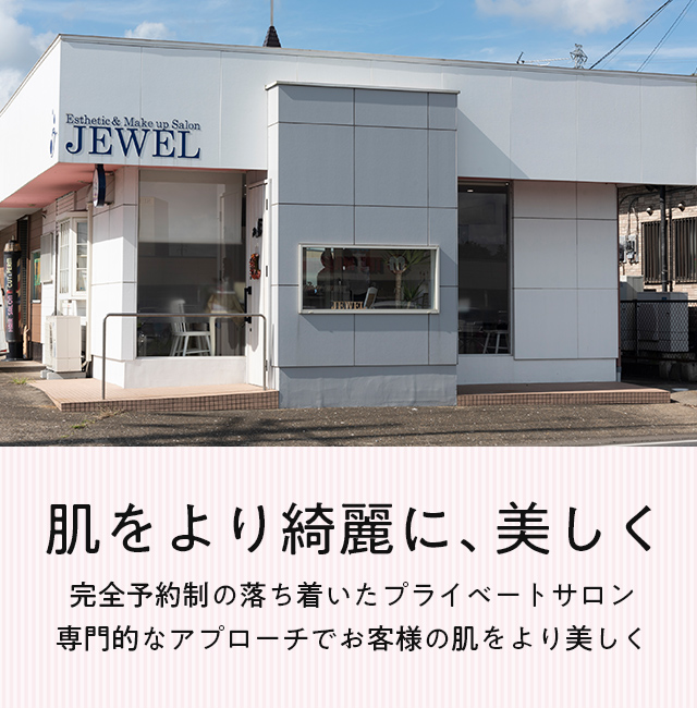 エステサロンJEWELは、リーズナブルな金額で通える完全予約制のプライベートサロンです。当サロンでは、お客様の肌の状態に合わせての施術やホームケアのご提案を行っております。また、施術後のフルメイクもサービスしておりますので、施術後に用事がある方でもお気軽にご来店いただけます。